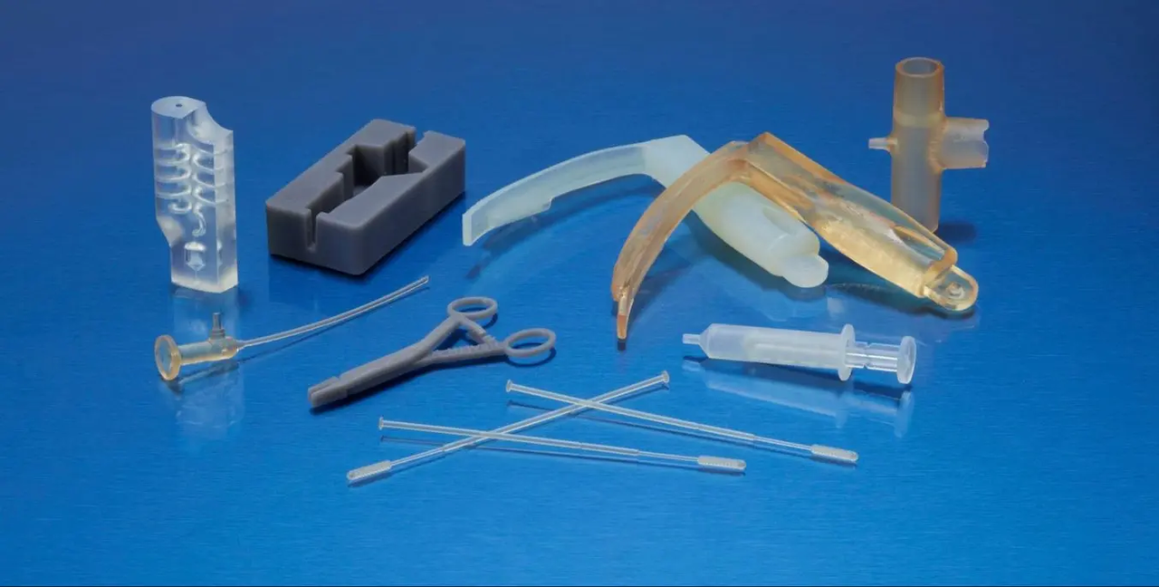 의료용 레진은 고해상도 출력이 가능하고 멸균이 용이해 수술용 가이드, 치과 보철물 등 정밀도가 필요한 의료 장비 제작에 널리 쓰입니다.